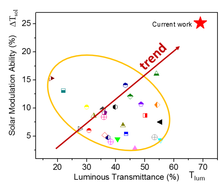 基于VO2相变薄膜的温控智能窗概念提出已有几十年的历史,但是实用化的智能窗产品还难以推出,主要原因在于:首先是对太阳光谱中红外光的调制力还不够强(一般<15%),使得智能窗的调控效果达不到实际要求;其次是可见光波段的透射率不够高(一般<60%),满足不了正常的室内采光需求,而且VO2相变薄膜的可见光透射率与红外光的调制能力互相制约,此消彼长,难以兼顾;最后就是其相对过高的相变温度(~68°C),极大地限制了其实用化。针对上述问题,传统的解决思路一般是通过掺杂和晶粒纳米化来降低VO2相变温度,通过表面织构或者多层膜等手段来改变VO2的光学特性等,但这些都难以从根本上解决上述问题。