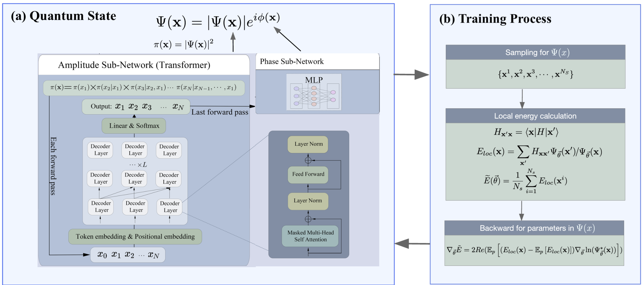 图:乾坤网络的架构图。(a) 用于构建电子波函数拟设的仅解码器Transformer架构,它将电子占据的轨道构型作为输入,输出波函数的振幅和相位。(b) 模型的训练流程,通过变分蒙特卡洛(VMC)方法对网络参数进行优化,以最小化体系的能量。