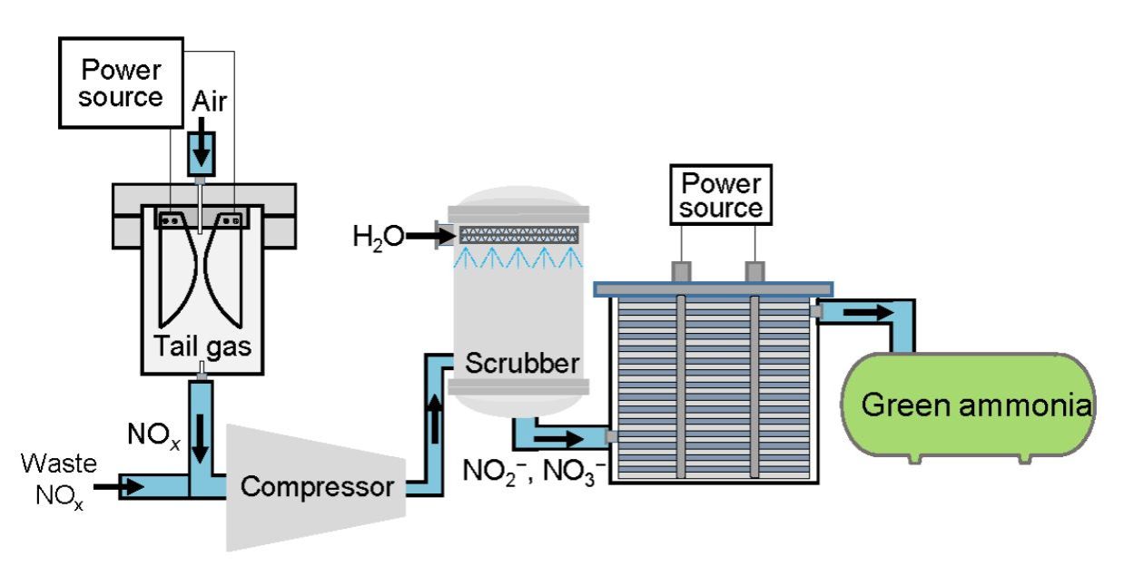 该技术采用“两步法”设计,即前端通过等离子体活化空气中的氮气生成氮氧化物,后端再将氮氧化物溶于水形成硝酸根,最后经电催化高选择性地还原为氨。与传统氮气还原反应相比,该技术规避了活化难、速率低的问题,同时为电催化硝酸根还原提供了稳定可控的氮源。此外,电催化反应所需的氮氧化物原料也可以从工业含氮废气中获取,这为废弃物的资源化利用带来了新的可能性。