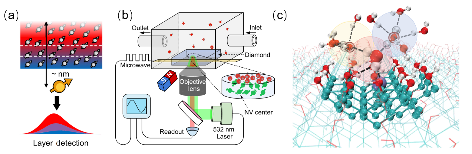 图(a)界面水分层探测原理示意图;(b) 基于金刚石氮-空位色心量子传感及流式样品腔的界面探测分析装置;(c)界面电子悬挂键附近氢键网络的分子动力学模拟。