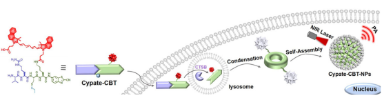 近日,中国科大化学与材料科学学院梁高林教授课题组和袁月教授课题组在肿瘤光声成像方面取得新进展。作者通过肿瘤高表达的组织蛋白酶B(CTSB)调控小分子光声成像探针在细胞内原位自组装成不易被细胞泵出的纳米探针,从而显著增强小鼠乳腺癌肿瘤处的光声成像信号,实现CTSB高表达肿瘤的特异性光声成像。相关研究成果于12月8日以《Cathespin B-Initiated Cypate Nanoparticle Formation for Tumor Photoacoustic Imaging》为文章标题,发表于国际著名学术期刊《Angewandte Chemie International Edition, DOI: 10.1002/anie.202114766》。