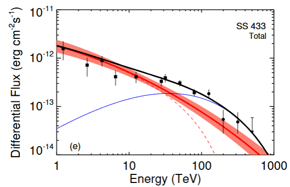 拉索的观测显示,这些系统的伽马射线能谱延伸至数百TeV甚至接近PeV,表明黑洞-喷流系统是极端高效的粒子加速器。尤其值得注意的是,SS 433的辐射形态在100TeV之下与X射线波段观测到的形态吻合,表明其源于喷流与黑洞东西两侧的星际介质相互作用产生的瓣状结构加速的电子;而在100TeV之上,辐射形态产生了变化,在南北方向产生了延展,并与黑洞周边一团由原子氢组成的质量云团位置重合(图1),强烈暗示SS 433的超高能伽马射线起源于由该系统加速的PeV质子与物质的强相互作用。而拉索对SS 433的能谱测量也显示出电子辐射与质子辐射共存的迹象(图2)。