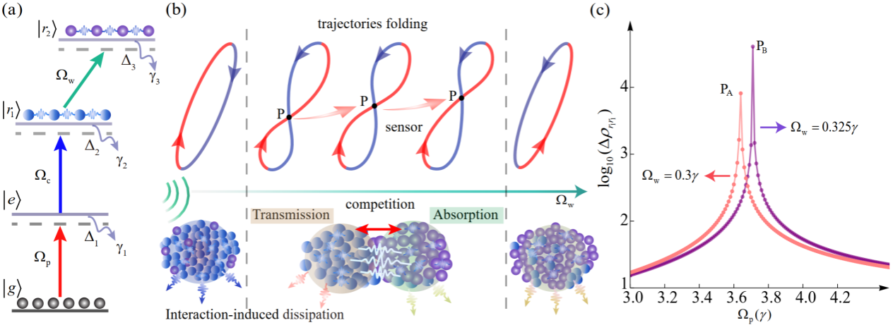图1: (a) 原子能级图。(b)折叠迟滞轨迹和原子系综示意图。(c) 探测光正向和反向扫描过程中里德堡态的布局差。