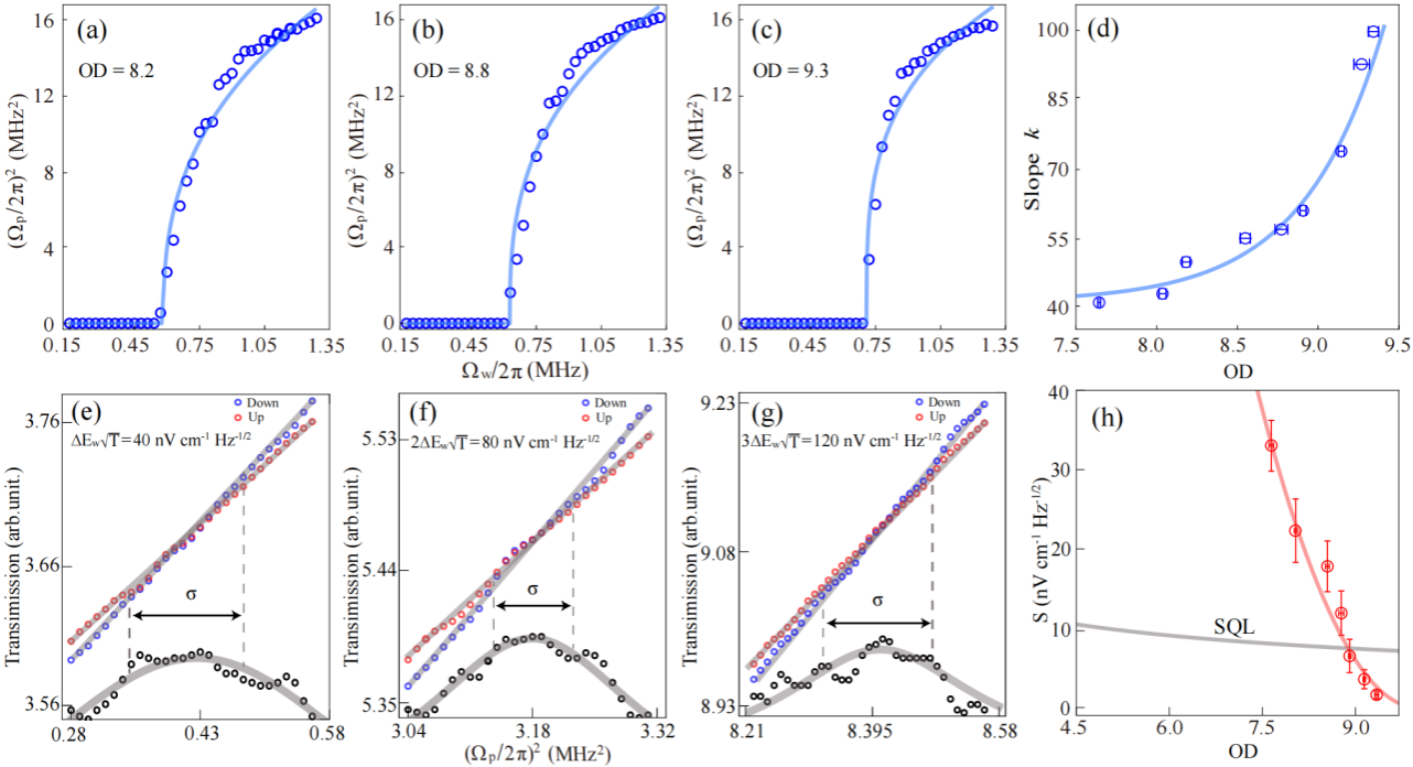 图3:(a)-(c)相边界随原子OD的变化。(d)相边界的斜率随原子OD的变化。(e)-(g)轨迹交点附近透射谱及不确定度。(h)系统灵敏度随原子OD的变化及标准量子极限(SQL)。
