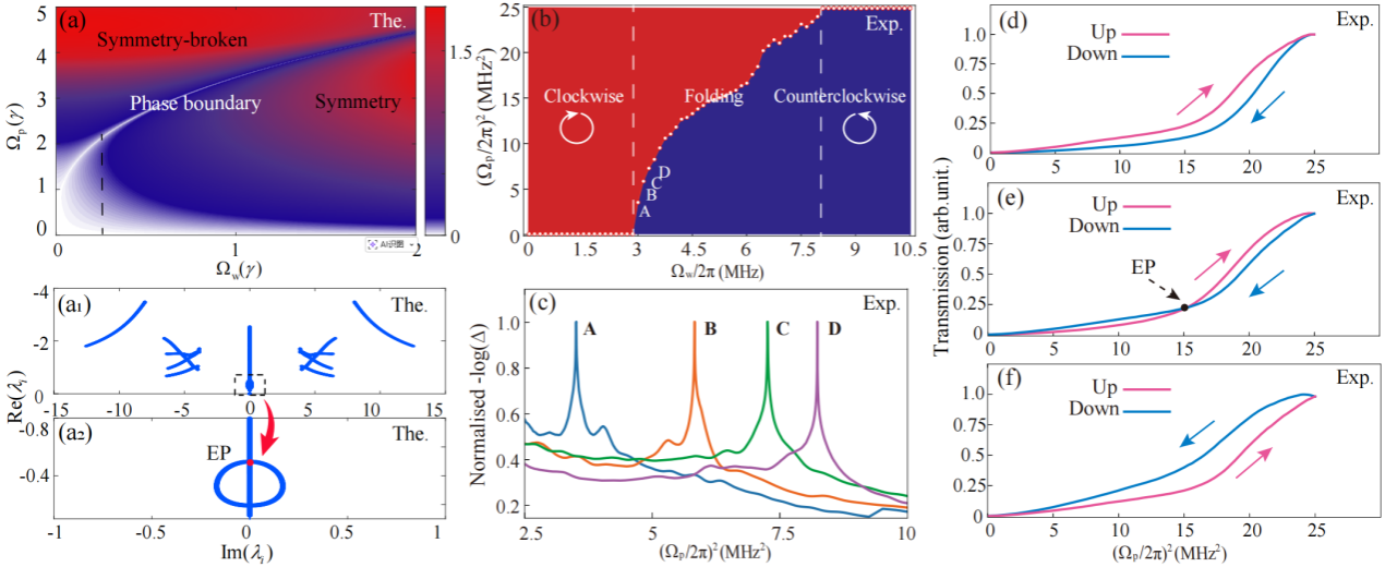 图2:(a)能隙相图的理论模拟。(a1)Liouvillian能谱和(a2)Liouvillian奇异点。(b)测量的迟滞轨迹变化相图。(c)轨迹交叠区域可分离透射谱。(d)-(f)测量的迟滞轨迹。