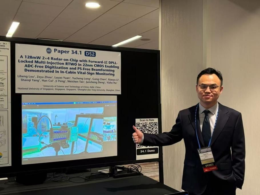 胡诣哲教授作专题报告并完成现场演示。该工作提出20 GHz 2TX×4RX全片上雷达,实现128mW低功耗运行,并通过ΔΣ-DPLL锁定RTWO实现ADC-free数字化与无相移器波束成形。结合调制与信号提取算法,在4m内呼吸误差≤4bpm、2m内心率误差≤5bpm,为车舱生命体征监测提供低功耗高集成解决方案。