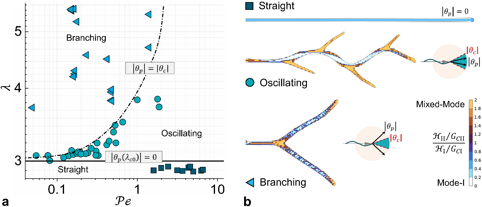 研究进一步定义了流体驱动多孔材料断裂的无量纲Péclet数(Pe),成功量化了裂纹扩展速度(对流效应)与流体侵入速度(扩散效应)之间的动态竞争关系,构建了系统的流体驱动断裂稳定性相图,实现对裂纹直线扩展、周期振荡以及分叉等不同模式的准确刻画。