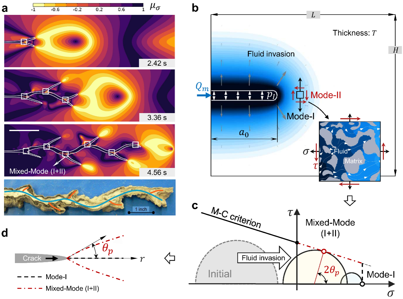 流体驱动断裂常见于油气压裂开发、生物组织破裂、地下熔岩流动等领域。尽管经典理论预言了直裂纹路径,但实验观测表明,准静态流体驱动裂纹依然会呈现明显的波状振荡轨迹。研究团队前期针对超临界二氧化碳注入页岩储层的工程场景建立了基于多孔弹性效应的渗-断耦合断裂相场模型,数值分析发现流体渗入产生的孔隙压力梯度改变了传统意义上流体驱动断裂的I型张拉破坏模式,在准静态扩展条件下出现了I-II型张拉-剪切混合断裂模式,从而诱发非对称分叉。这些反常的实验现象与数值线索共同指向一个关键问题,即准静态下的流体驱动断裂存在不稳定扩展因素,然而其固有失稳模式和机制尚不清楚。