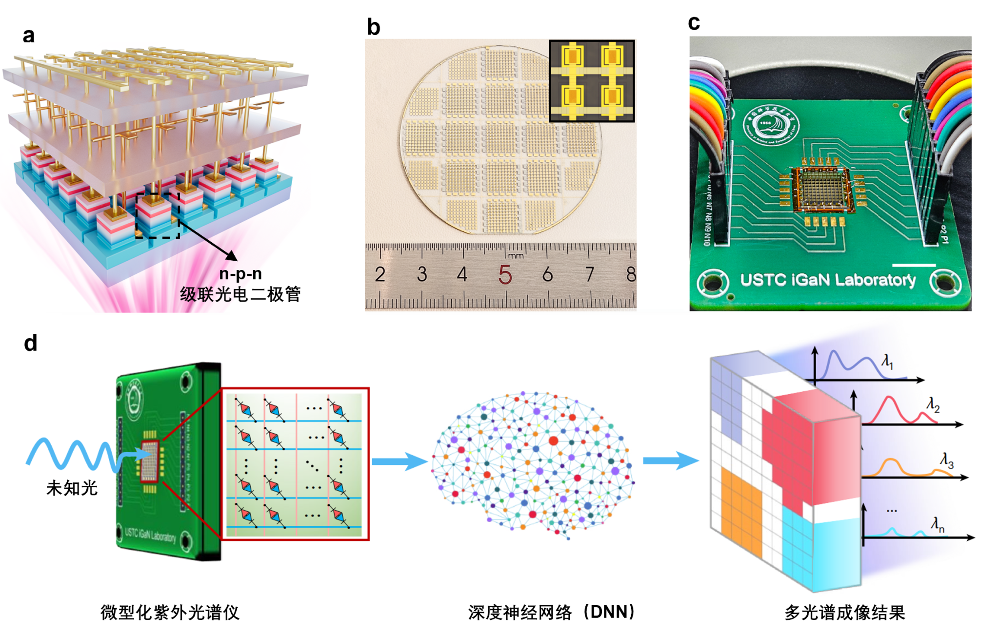近日,中国科学技术大学微电子学院孙海定教授iGaN实验室,联合武汉大学刘胜院士团队,成功研制出微型化紫外光谱仪芯片,并实现片上光谱成像。该芯片基于新型氮化镓基(GaN)级联光电二极管架构,并与深度神经网络(DNN)算法深度融合,实现了高精度光谱探测与高分辨率多光谱成像,其光谱响应速度创下了目前已报道微型光谱仪的最快世界纪录(纳秒级)。